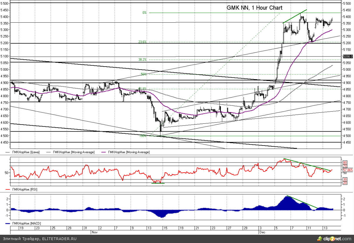 Несмотря на то, что трендовые индикаторы постепенно начинают разворачиваться наверх, существенного подъема котировок в среднесрочной перспективе (до конца года) уже не ожидается. Ключевой диапазон торможения роста расположен в районе 5480-5500 руб. На мой взгляд, это тот максимум, который может быть показан при идеальном стечении обстоятельств. Стоит отметить, что в случае подъема котировок выше предыдущего экстремума (5426 руб.), наверняка поступит разворотный сигнал со стороны 4-часового RSI (медвежья дивергенция), что будет мешать восходящей динамике. Таким образом, несмотря на то, что высока вероятность продолжить недавнее ралли, открытие длинных позиций в рамках сложившейся ситуации несет в себе высокие риски. Главным образом сложности возникают с выставление оправданных и логичных стоп-заявок (они слишком далеко). К тому же следует сказать, что уже со следующей недели активность торгов на рынке наверняка заметно снизится. В преддверии новогодних праздников зачастую резко падает волатильность.