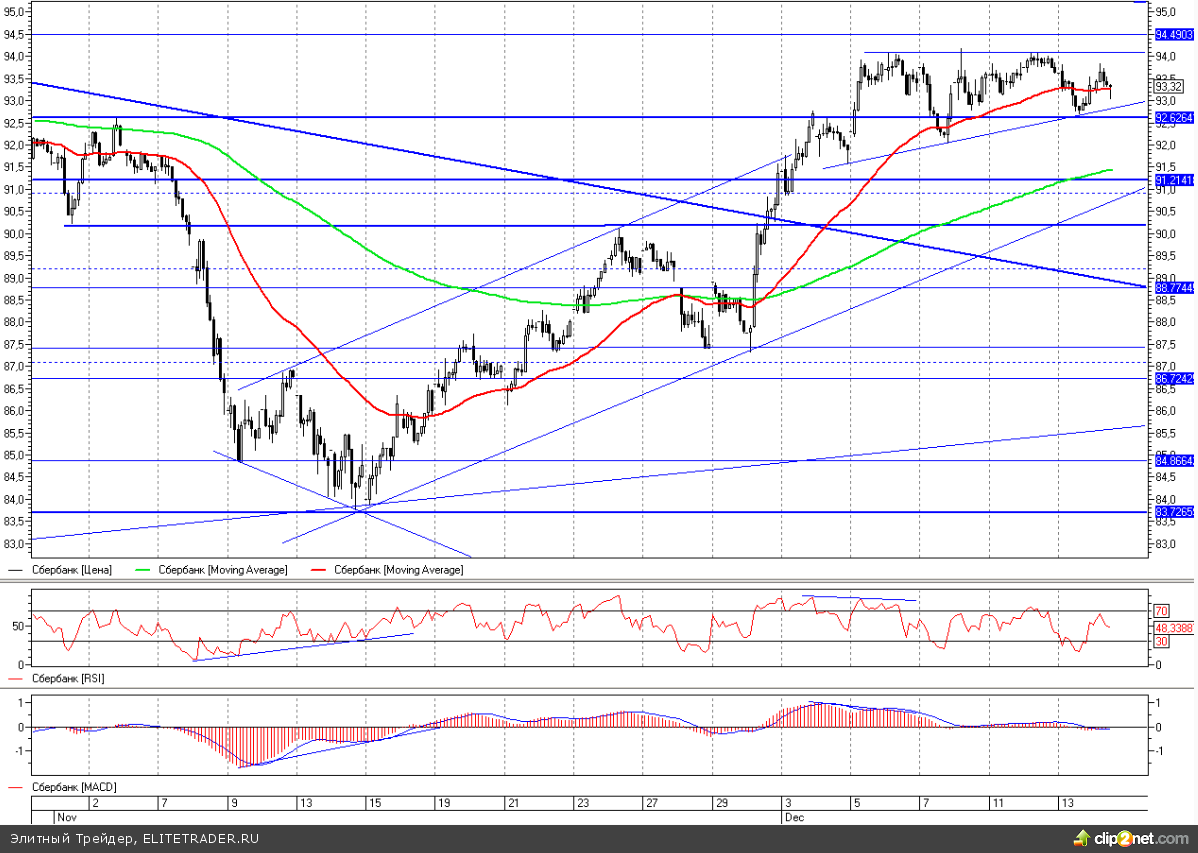 По предыдущей торговой рекомендации в районе отметки 94 мы зафиксировали часть длинной позиции, открытой от уровня 92,6. После этого бумага откатилась вниз, снова протестировала уровень 92,6 и к текущему моменту продолжает движение в сформировавшемся диапазоне 92,6 - 94. По большому счету техническая картина за это время не изменилась, по-прежнему продолжается консолидация выше пробитого уровня сопротивления, что чаще всего приводит к продолжению роста. Ключевым уровнем для быков по-прежнему является диапазон 94 - 94,5, пробой которого приведет к достижению линии нисходящего тренда, берущей начало с весны текущего года, которая проходит сейчас чуть выше уровня 95. При этом все еще сохраняется вероятность реализации «тройной вершины», которая начнется в случае закрепления под уровнем 92,6. При развитии этого сценария потенциальной целью выступит диапазон 89 - 90, где проходит статический уровень поддержки, а также пробитая линия нисходящего тренда. Таким образом, пока имеет смысл сохранять оставшуюся часть лонга с ближайшей целью в районе 95, при этом переворачиваться в шорт можно в случае закрепления ниже уровня 92,6.