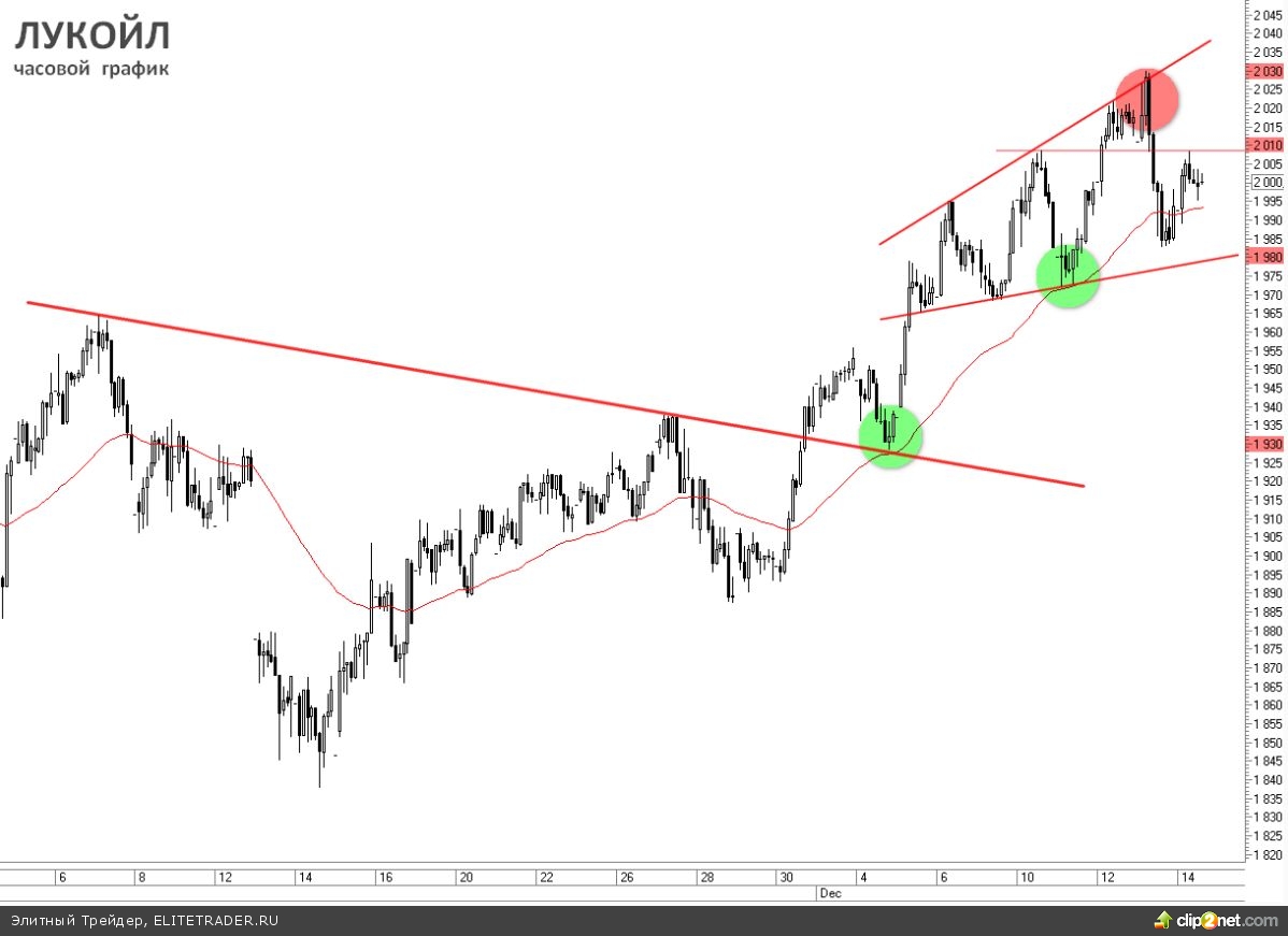 По предыдущей торговой рекомендации по Лукойлу мы предложили задуматься над фиксацией покупок в момент когда цена достигла верхней границы расходящегося треугольника. Для тех, кто не боится торговать против тренда - можно было открывать короткие позиции. В итоге разворотная формация начинает обретать отчетливые очертания, если в ближайшее время быкам не удасться закрепиться выше 2010 рублей за акцию - перспектива достижения локальных максимумов в этом году станет совсем призрачной.