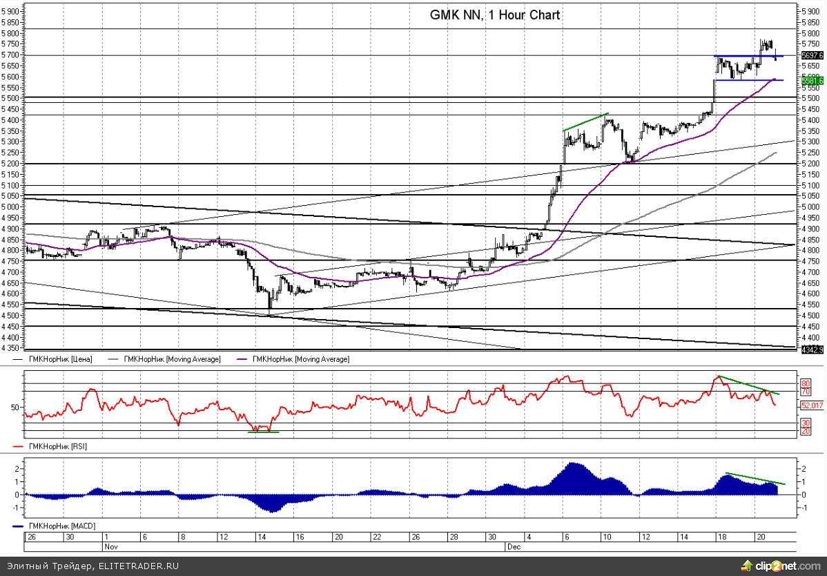 Сейчас на часовом и 4-часовом временных интервалах сформированы очень сильные продажные сигналы, а именно стандартные медвежьи дивергенции на RSI и MACD. Также отмечу, что 4-часовая кривая RSI в данный момент пробивает сигнальную линию в 70п. сверху вниз, давая четкие указания для движения вниз. Вместе с тем не пропускаем и тот факт, что сегодня котировки возвращаются в рамки ранее покинутого флага, полностью так и не отработав его потенциал. Ну а про общую дневную перекупленность даже не стоит упоминать, она по-прежнему как никогда актуальна. Тем не менее, все-таки стоит помнить, что в предыдущие дни подобные сигналы в итоге были проигнорированы. Ближайшая поддержка в данный момент расположена достаточно далеко - это уровень 5430 руб.