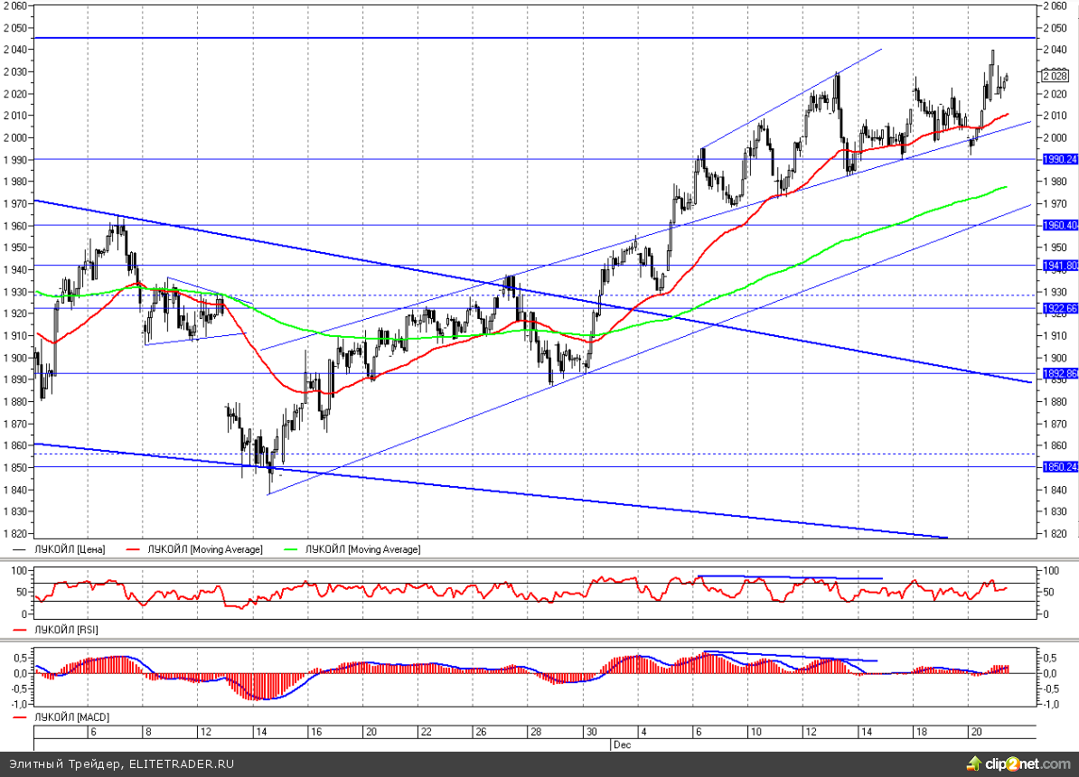 Акции Лукойла, с момента выхода последней торговой рекомендации, оттолкнулись от поддержки на 1990 и уже практически достигли полуторалетнего максимума на 2045, однако сегодня откатились вниз в результате негативного открытия. Тем не менее, продолжать снижение медведи не торопятся, и к текущему моменту мы наблюдаем попытку закрыть образовавшийся утренний гэп. В целом же движение продолжается в диапазоне 1990 - 2045, границы которого удалось подтвердить, а также вдоль пробитой ранее линии краткосрочного восходящего тренда. Если прошлый раз мы говорили о формировании предпосылок для разворота и возобновлении снижения, то к текущему моменту картина уже несколько изменилась, и бумага, по всей видимости, намерена завершить уходящий год в границах сформировавшегося боковика. На следующей неделе активность западных инвесторов будет крайне низкая в связи с празднованием Рождества, и отечественный рынок также начнет терять объемы и активность игроков. В этом свете более предпочтительной становится локальная игра на отскоках от границ диапазона, при этом обязательно нужно иметь стоп, желательно с переворотом, на случай возобновления резкого движения.