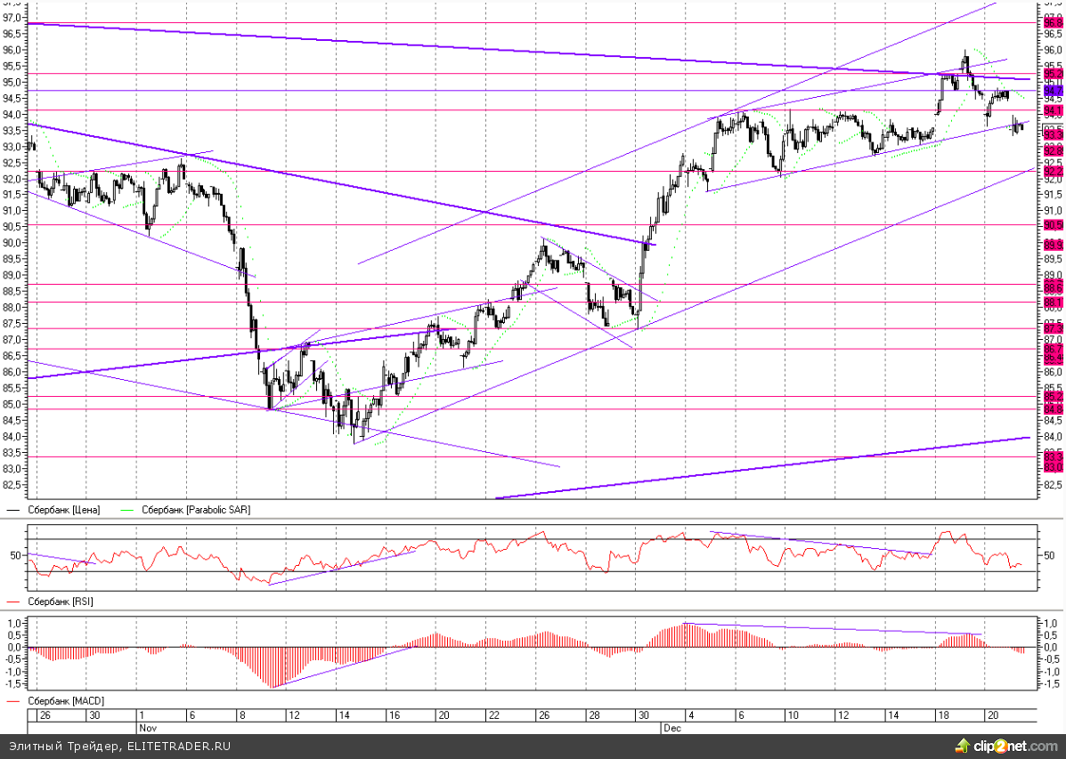 Цена на бумаги Сбербанка в уходящую неделю впервые с сентября вернулась к отметке 96, пытаясь пробить нисходящий тренд 2012 года. Последующий откат, вынуждает считать данный пробой ложным, котировки даже день не смогли закрыть выше данного рубежа. Как и предполагалось, в середине недели цена благополучно вышла на закрытие гэпа к отметке 93,6, отскок от которой был лишь локальным. Пятничный старт торгов вновь обозначил ценовой разрыв с пробоем нижней границы краткосрочного восходящего канала, которая теперь удерживает порывы быков сыграть на закрытие данного гэпа. Тем не менее, пока цена движется в месячном восходящем канале и перспективы снижения определены лишь уровнями 92-92,5. С подобными целями набирать короткие позиции комфортнее все же после рывка цены к 94,1, нежели с текущих уровней. В то же время, если цена провалится к up-тренду, но удержится от его пробоя, незакрытый ценовой разрыв станет очевидной краткосрочной целью отскока, не смотря на ухудшение технической ситуации на дневном таймфрейме.