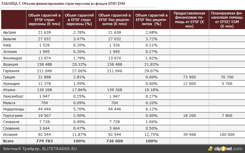 На текущий момент благодаря реструктуризации греческого долга стоимость его обслуживания находится на вполне приемлемом уровне: в течение следующего года процентные платежи по государственным заимствованиям составят 3 237 млн евро или 1.66% от ВВП и это ниже, чем по еврозоне, где среднее значение этого показателя составляет 2.12%. Подобный парадокс вполне объясним с учётом того, что в последние 2 года стране всё большую часть своих долгов приходилось рефинансировать за счёт международных кредитов, а на открытых рынках была возможность заимствовать только через краткосрочные векселя. Тем не менее, текущий сохраняющийся дефицит бюджета Греции в 9.4% в совокупности с негативной кредитной историей по-прежнему будут препятствовать возможности рефинансироваться без помощи Единого стабилизационного механизма (ESM). В следующем году Греции предстоит погасить 31.466 млн евро государственных облигаций, включая процентные платежи. Из этой EFSF будут предоставит 16.5 млрд евро в следующем году, из которых минимум 7.6 млрд евро придётся затратить на рекапитализацию банков. В итоге, не менее 22.57 млрд евро Греции придётся заимствовать из других источников таких, как кредиты МВФ (на сумму в 19.8 млрд евро до конца 2014 года) и заимствования на открытом рынке. В течение этого года размещение греческих государственных облигаций происходило со сроком не более полугода, т.к. ставки на более длительный срок были бы запредельно высокими ввиду низкого уровня доверия инвесторов к их кредитному качеству. Последнее размещение полугодовых векселей Греции в 2012 году прошло 11 декабря на сумму 1.625 млрд евро под 4.38% годовых при спросе в 1.54 выше предложения. Своего же максимума ставка по ним на аукционах достигала 12 июня, достигая значение 4.73%. Не исключено, что при дальнейшем наращивании объёмов первичного предложения мы увидим обновление максимумов по их ставкам, что потребует очередной реструктуризации. Для участников рынка ставка по краткосрочным векселям в евро на уровне выше 4.5% кажется более, чем привлекательной с учетом, что доходность суверенных краткосрочных векселей эмитентов инвестиционного качества находится вблизи нуля. И тем не менее, в случае очередного бегства в качество на первичных размещениях греческие векселя могут перестать пользоваться спросом, что неминуемо потребует очередной реструктуризации и/или дополнительных вливаний из EFSF. Всего же Греции уже было выделено 73.9 млрд евро в рамках ESM и, согласно данным EFSF, может быть выделено ещё 70.7 млрд евро, что в совокупности составляет 144.6 млрд евро. При этом активы самого фонда EFSF составляют на текущий момент 726 млрд евро вместо запланированных 779.78 млрд евро по той причине, что свои взносы не могут в него пока внести Греция, Португалия, Ирландия, являющиеся его реципиентами. Таким образом, на страну с долей ВВП в 2.05% и долей долга 3.98% от совокупного значения еврозоны придётся затратить 18.54% средств Единого фонда финансовой стабильности. И если мы рассмотрим пессимистичный сценарий, при котором в течение следующего года процентные ставки по большинству суверенных облигаций в евро будут расти, то встаёт вопрос о том, во что тогда может вылиться помощь Испании, у которой такой же дефицит бюджета в 9.4%, как и у Греции, но при этом объём долга выше в 2.8 раза