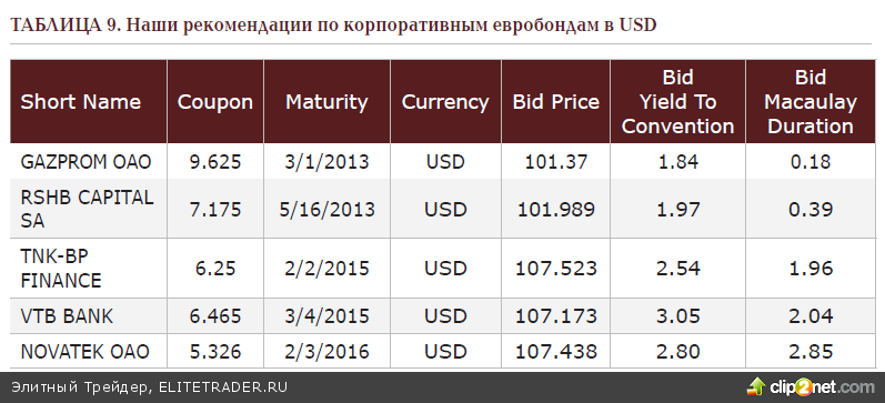 Так, выпуск Russia 2028, на который мы особенно обращали внимание в рекомендациях, т.к. он необоснованно торговался выше по доходности относительно своей дюрации к текущему моменту, (21.12.2012 года) с начала квартала упал в доходности с 4.349% до 3.836% годовых. В результате этого цена выросла со 194.959% до 203.395% от номинала, что эквивалентно доходности только от ценовой переоценки в 20.75% годовых. Добавим к этому купон по данному выпуску в 12.75% и получим итоговую доходность в долларах 33.5% годовых. В настоящий момент восходящий тренд по суверенным российским суверенным еврооблигациям продолжается, и последняя цена, зафиксированная по Russia 2028 на момент написания данного текста (203.395%), является также и историческим максимумом. Соответственно, сопоставимо растут и другие длинные выпуски. И в то же время, несмотря на столь сильный восходящий тренд, мы не считаем оправданным в предстоящем квартале сохранять позиции в длинных выпусках, надеясь на продолжение ралли. Ориентируясь, опять же, на выпуск Russia 2028 с купоном 12.75%, который наиболее близок по модифицированной дюрации к 10-летним US Treasuries, спред российских евробондов к американским казначейским облигациям составляет 209 б.п. В среднесрочной перспективе при беспрецедентных объёмах накачки экономики ликвидности со стороны ФРС, притом что часть денег будут идти на рынок через ипотечные облигации, а не US Treasuries. Скорее стоит ждать по ним роста доходности, и в этом случае при достаточном узком спреде с учетом кредитного качества мы увидим коррекцию и в российских евробондах. В этих условиях, возможно, рублёвые выпуски будут более интересны, однако тем инвесторам, которых интересует прежде всего доходность в долларах, можно посоветовать короткие выпуски корпораций приемлемого кредитного качества