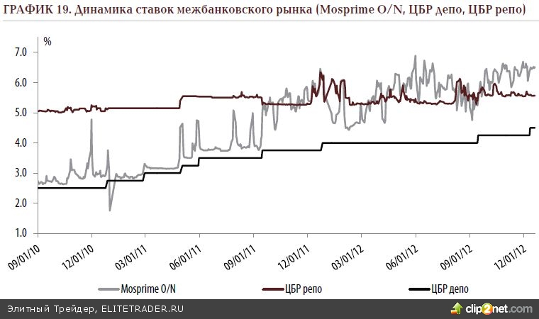 В случае комфортной рыночной конъюнктуры ставка Mosprime O/N движется в коридоре «ставка ДЕПО – ставка РЕПО», больше тяготея к его нижней границе (например, период «сентябрь 2010 – сентябрь 2011»). Текущее же повышенное её значение говорит о недостаточно комфортной ситуации с ликвидностью (эту тему мы рассмотрим в дальнейших параграфах стратегии).