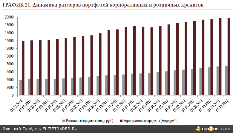 Учитывая текущий окрас политики Банка России, меры, которые планируется воплотить в жизнь в новом году, экономические метрики и ряд других моментов, мы прогнозируем замедление темпов роста розничного кредитования в 2013 году с нынешних почти 40% до 20-25%. Основная борьба сейчас ведётся как раз с розничными кредитами, так что они и должны попасть под наибольшую «раздачу». Как правило, доля их в совокупных банковских портфелях меньше корпоративных кредитов. Однако регулятор не хочет дожидаться перегрева, заранее делая рынку прививки. Однако темпы роста хоть и замедлятся, но все равно останутся на высоком уровне. Лучше всех в текущей рыночной среде будут чувствовать себя банки, имеющие солидные капитальные запасы.