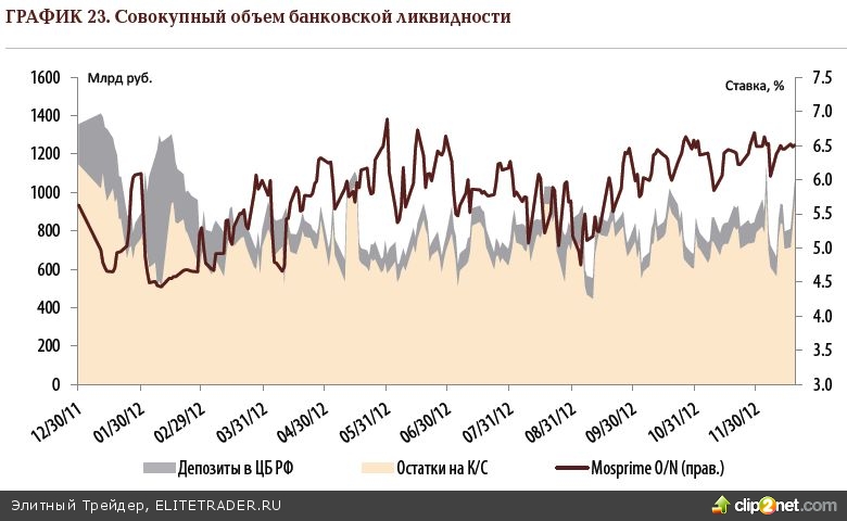 Говоря о перспективах 1 кв. 2013 года, мы не видим на горизонте предпосылок к осязаемому улучшению ликвидной атмосферы. В начале квартала ситуация может быть несколько менее напряжённой ввиду традиционного притока бюджетных средств в систему в конце года, однако впоследствии поговорка «долг платежом красен» станет более чем актуальной. К сожалению, вероятнее всего, и 1-й квартал 2013 года пройдёт под знаком дефицита ликвидности. Такого мнения придерживается и отечественный регулятор, который в декабре озвучил прогноз о сохранении достаточно больших объёмов дефицита средств у банков данный временной период. Заместитель председателя Банка России Сергей Швецов в декабре напомнил о том, что задолженность банков составляет около 600-700 млрд рублей, значительный её объём будет перенесён через новогодний экватор. Вероятнее всего, возникнет ситуация, при которой бюджетные вливания не смогут перевесить скопившийся у банков дефицит. Минфину солидная часть его кровных средств может потребоваться уже в январе, в связи с чем ещё раз пролонгировать свои депозиты на февраль он тогда не сможет.