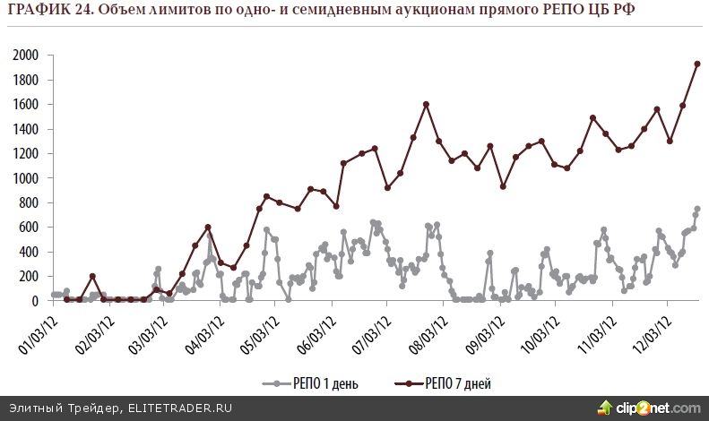 Анализируя шаги Банка России, можно сделать вывод и о том, что проявлять излишнюю щедрость, раздавая средства направо и налево, регулятор в предстоящем квартале особо не собирается. Вероятнее всего, всё по обыкновению будет сведено к искусной игре лимитами по операциям РЕПО. В чём- чём, а в этом ремесле ЦБ РФ является мастером. На представленном ниже графике приводится динамика лимитов по однодневным и недельным операциям РЕПО. Мы видим, что на своих аукционах однодневного прямого РЕПО регулятор был довольно щедр, при необходимости наращивал объёмы предложения со своей стороны. Банки активно данными средствами пользовались, показывая наибольший интерес в конце месяца, когда налоговые платежи все сильнее давали о себе знать