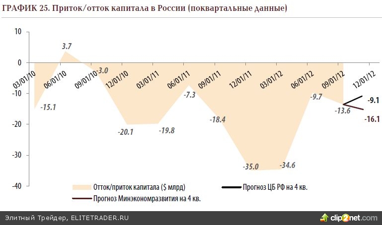 Нельзя не упомянуть и о таком опостылевшем явлении, как отток капитала из России, который, по нашей оценке, продолжит оказывать свое негативное влияние на ликвидную обстановку. Сперва обратимся к официальным цифрам. Так, согласно оценке ЦБ РФ из отечественной экономики в первом квартале утекло 34.6 млрд долларов, во втором – 9.7 млрд долларов, в третьем – 13.6 млрд долларов, а всего за январь-октябрь был выведен 61 млрд долларов средств. Прогнозируя же суммарный отток по итогам 2012 года, регулятор дает уточненную (ноябрьскую) оценку «не более 67 млрд долларов». Минэкономразвития в этом плане более пессимистично, прогнозируя уровень в 73-75 млрд рублей. Оба ведомства смотрели раньше на данную проблему оптимистичнее (например, говоря о притоке в пост-выборный период), однако со временем задора у них поубавилось. Методом простого вычитания из данных годовых оценок суммы оттока за три квартала, мы получим следующие прогнозы на 4-й квартал: ЦБ РФ – 9.1 млрд долларов; Минэкономразвития – 15.1-17.1 млрд долларов