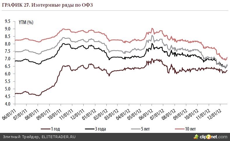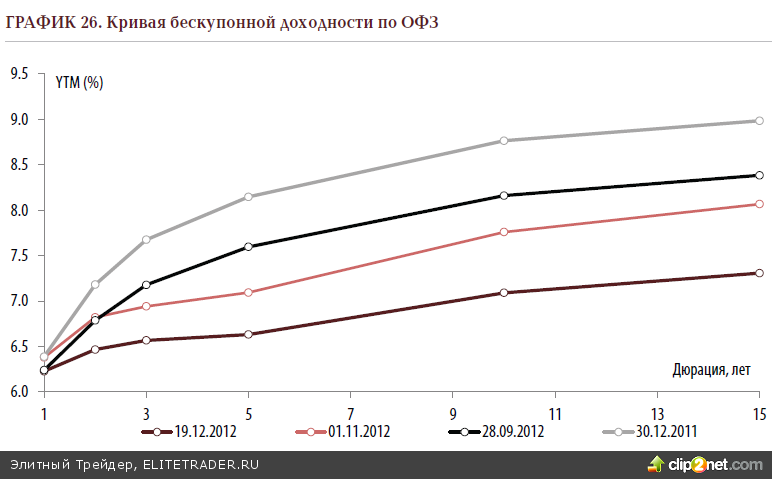 Однако впадать в эйфорию по поводу либерализации мы бы не советовали, так как отечественные ОФЗ и так уже очень хорошо заработали в текущем году на спекуляциях на эту тему. Кривая госбондов не только существенно съехала вниз, но и стала более пологой. Основной камень преткновения сейчас – инфляция, которая в России далеко не мизерная. ОФЗ, конечно, могут переместиться в зону реальных отрицательных доходностей, но потенциал здесь будет ограничен. Учитывая уже свершившиеся победы, а также принимая во внимание самочувствие основных драйверов рынка (высокие нефтяные ценники, лояльное отношение инвесторов к риску), логично было бы рассчитывать на снижение доходностей в 1-м квартале 2013 года в переделах 35-45 б.п., но не более того. Во всём должно быть своё чувство меры. Либерализация не может выступать в качестве бездонного колодца позитива для отечественных бумаг.