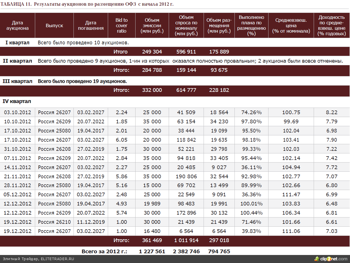 Сделаем небольшой исторический экскурс. Как все мы прекрасно помним, что 2-й квартал 2012 года прошёл далеко не под знаком Минфина, не позволив сбыться и половине его довольно амбициозных планов, в итоге удалось привлечь с рынка всего 93.7 млрд руб. при цели в 284.8 млрд. Май вообще оказался из ряда вон выходящим и прошел совсем мимо министерства, лишив его потенциальных 90 млрд руб. Все три аукциона не принесли своих плодов (один аукцион не состоялся в силу отсутствия спроса, два были вовсе отменены). Палки в колёса вставлял рыночный негатив: мы наблюдали стремительное снижение нефтяных котировок (что наносило удар по рублю и номинированным в нём активам), еврозона вгоняла инвесторов в сильную апатию, воцарилась неразбериха касаемо либерализации рынка с возможностью её полного срыва. В 3-м квартале ситуация начала выправляться (ожила нефть, тема либерализации сдвинулась с мёртвой точки), что сформировало для Минфина благоприятную среду для размещения ОФЗ, чем он с радостью и воспользовался. В итоге с рынка удалось забрать 228.2 млрд руб. средств.