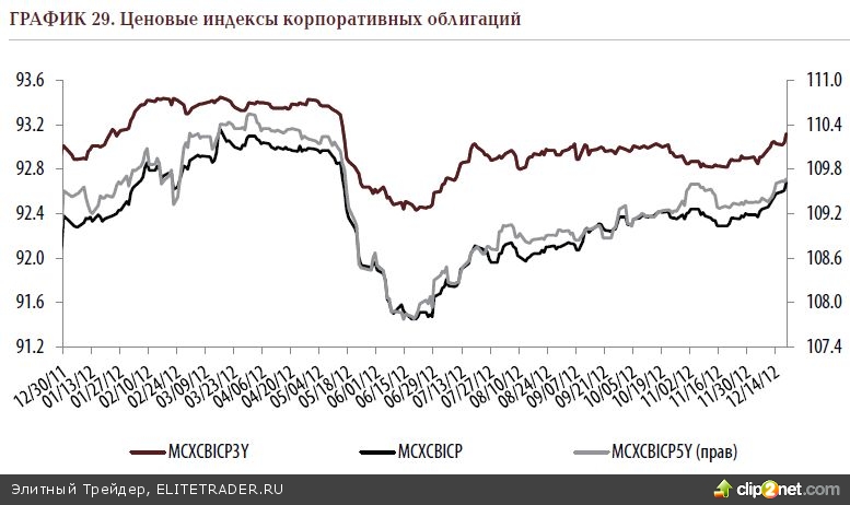 Часто мы видели довольно вялую динамику, а порой завоёванные рубежи столь же быстро сдавались после очередного притока негативных настроений извне. Вот, например, в начале октября ценники корпоративных бондов зафиксировали умеренное снижение, после чего скорректировались вверх, однако в последнюю декаду месяца вновь переместились на «красную территорию». Отрицательные переоценки перетекли и на первые две декады ноября, после чего смогли встать на лыжню восстановления, компенсировав предшествующие затраты. В целом, на протяжении квартала палки в бондовые колеса вставляли нестабильная внешняя конъюнктура вкупе с ограниченной ликвидностью. Инвесторы по всему миру переживали за судьбу Греции, опасаясь возможного дефолта страны-страдальца. Да и без этого у них было достаточно поводов для беспокойства. Однако впоследствии солидная доля рыночного напряжения была снята, в частности и ввиду разрешения греческой дилеммы (что повысило аппетит инвесторов к рисковым классам активов), более оптимистичного взгляда инвесторов на проблему фискального обрыва в США. Коллапса «здесь и сейчас» не случилось, что и приободрило рынки.