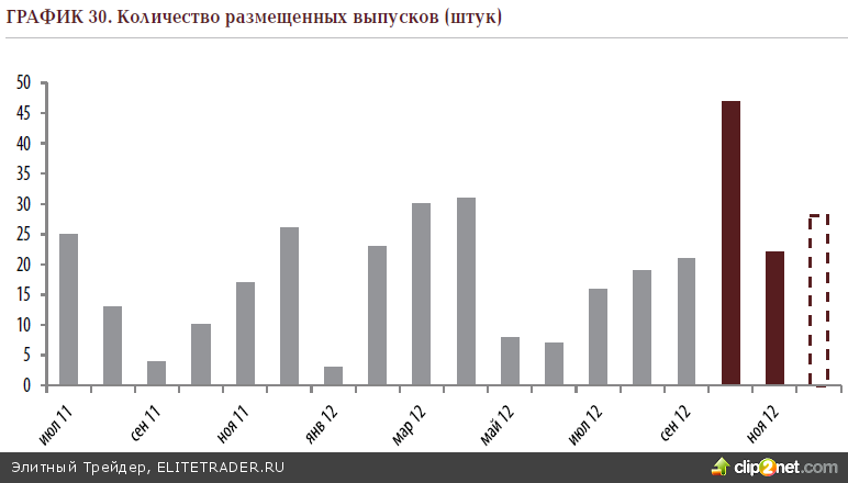 В ноябре первичный сектор вел себя поспокойнее, количество предложений снизилось в два с лишним раза, да и сами по себе они уже не были столь объёмными. В итоге, суммарная выручка составила лишь пятую часть от октябрьского объема – 62 млрд руб. Наибольшую лепту внесли такие компании, как ОАО «Ростелеком» и АК «АЛРОСА», их вклады в общий котел составили по 10 млрд рублей. В декабре же отечественные организации вновь активизировались и продолжили облигационную бомбардировку, за первые две декады месяца они уже успели разместить 28 выпусков на 108 млрд рублей. По итогам года результат будет ещё более солидный.