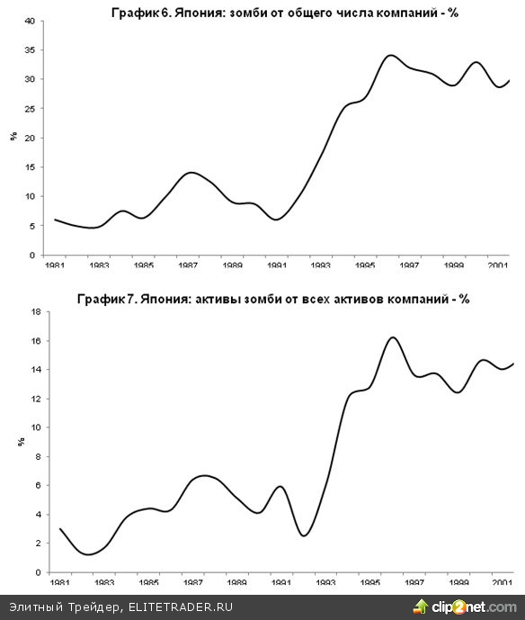 Одной из самых больших проблем, которые образовались в 1990-е годы, стало повсеместное распространение того, что Кабаллеро, Хоши и Кашьяпа называют зомби-фирмами. Зомби-фирмой называется непроизводительное и нерентабельное предприятие, которое должно покинуть рынок, но остается на плаву благодаря помощи со стороны кредиторов и государства. Продолжая вести операционную деятельность и держась за работников, которые должны были бы перейти в более эффективные и производительные компании, зомби-фирмы подрывали эффективность всей экономики. Здоровые предприятия развивались медленнее, и если со временем присутствие зомби становилось достаточно обширным, уровень производительности в секторе падал.
