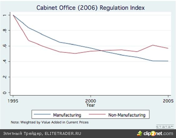 Индекс государственного регулирования для обрабатывающего сектора упал до 0,4 пункта к 2005 г., в то время как для непроизводственного остался в районе 0,6 пункта. Таким образом, за одно десятилетие (с 1995 по 2005 гг.) процесс либерализации госрегулирования в большей степени наблюдался в производственном секторе. В то время как процесс либерализации в производственном секторе проходил постепенно, дерегуляция в непроизводственном сегменте экономики ускорилась в 1990-е, однако затем остановилась.