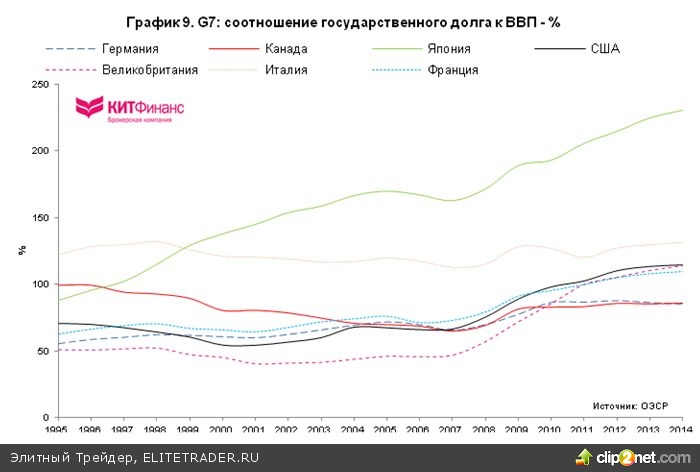 С 1992 по 2007 г. (до начала глобального финансового кризиса) объем чистого государственного долга к ВВП Японии вырос с 20% до 80%; с 2007 г. долг пошел по экспоненте и уже достигнет, по оценкам ОЭСР, 230% от ВВП к 2013 г. (см. график 9).