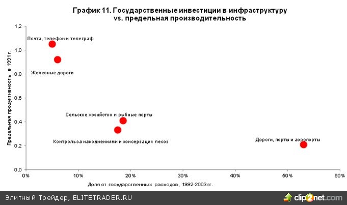 На графике 11 показан процент государственных расходов, распределенных по категориям с 1992 по 2003 гг., и оценка инвестиционной эффективности по расчетам Дои-Ихори. Как видно, большая часть ресурсов пошла развитие проектов с низкой отдачей. Общий объем государственных средств, направленных в три группы инфраструктурных проектов, составил 213 трлн иен за период с 1992 и 2003 гг. (89% от всего объема государственных инвестиций за этот период).