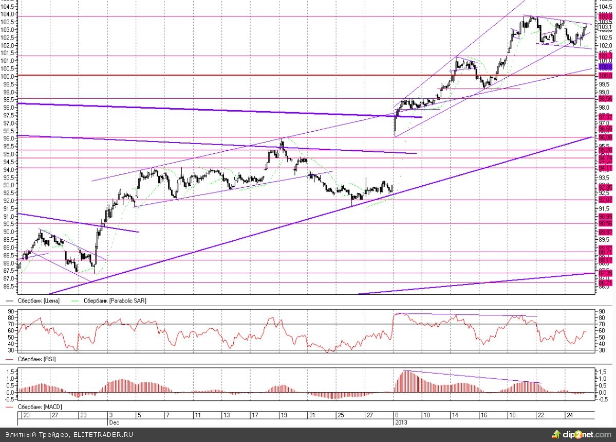 Котировки акций Сбербанка после обновления в начале недели многомесячных максимумов впоследствии ушли в консолидацию на уровнях 102-104, которая угрожает стать тройной вершиной с целями снижения в район психологически важного рубежа на 100 руб. В то же время не все столь однозначно, и данная консолидация может быть частью фигуры продолжения тенденции бычий флаг, в случае пробоя верхней границы и обновления достигнутых максимумов. Цели фигуры еще более впечатляющие нежели тройной вершины и достигают отметки 108 руб. Впрочем, безусловно, закрытие январского гэпа выглядит не менее привлекательно. Сигналы осцилляторов в текущей ситуации как на часовом так и на дневном таймфреймах призывают все же ориентироваться на медвежий сценарий, тем более, что был пробит локальный двухнедельных up-тренд. В частности кривые RSI и стохастика на дневном графике покинули зону перекупленности, указывая направление вниз. Кроме того, стоит обратить внимание на разворотные дневные свечи в динамике американских индексов, выступающих ориентиром для российских инвесторов.