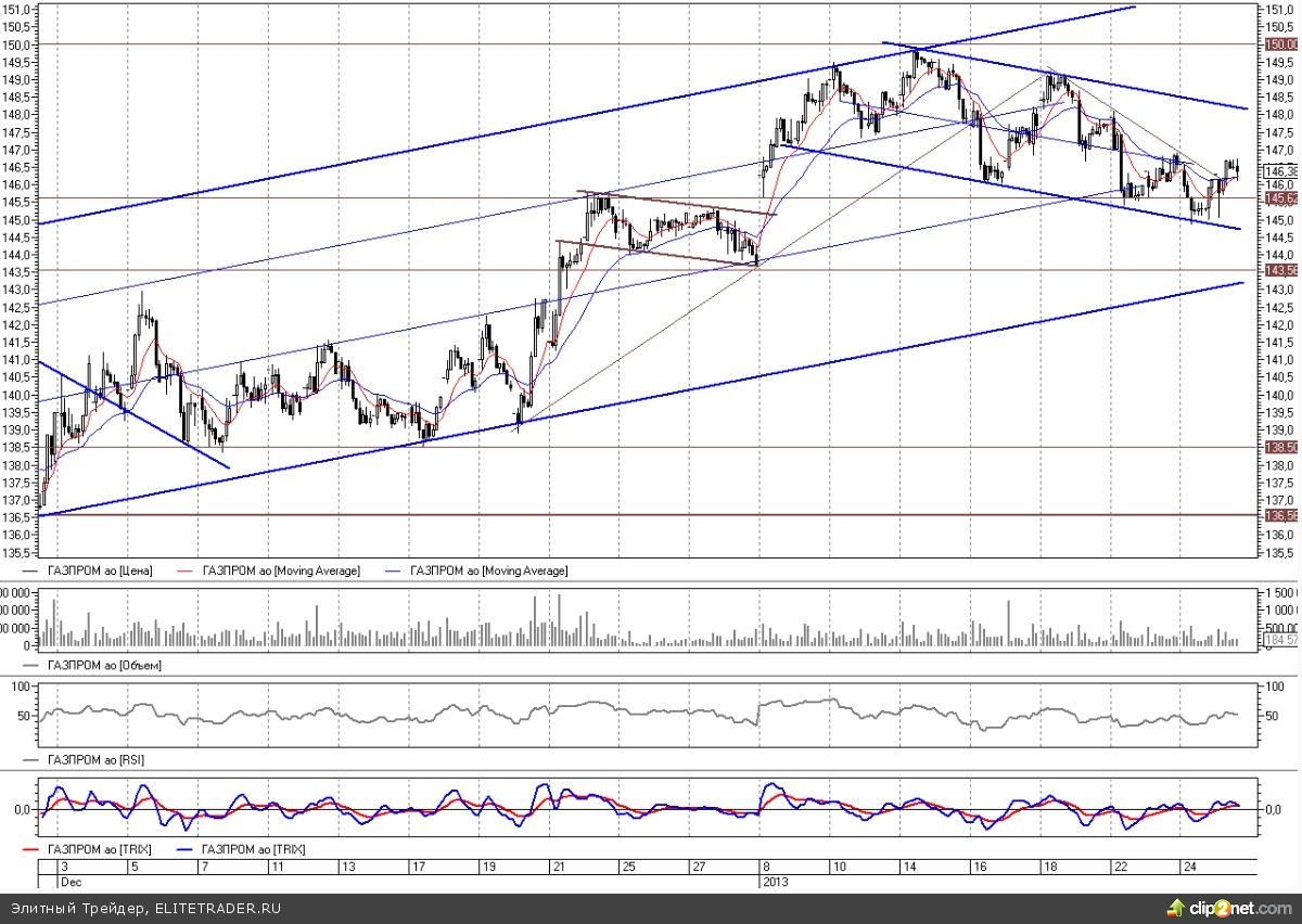 С технической стороны ситуация за прошедшую неделю претерпела мало изменений. Газпром по-прежнему снижается в границах двухнедельного нисходящего канала и от его нижней границы в районе 145 накануне последовал отскок вверх. Цена сегодня пробила линию локального сопротивления на 146, после чего появилась возможность организовать заход выше к линии сопротивления этого канала на 148.