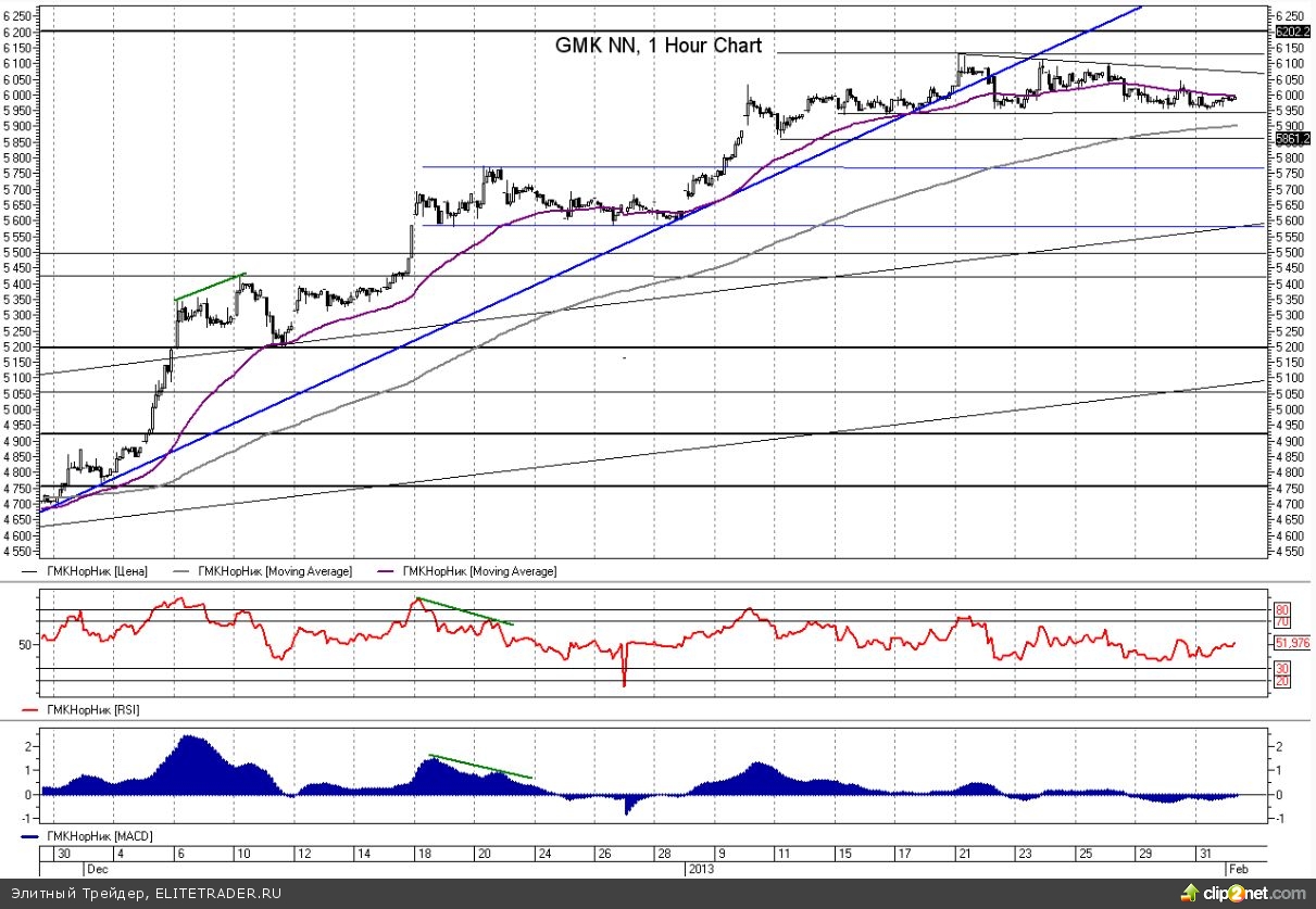 Как уже ранее много раз отмечалось, ближайшая поддержка расположена в районе 5860 руб. Спуск ниже этой отметки будет означать, что последовательная тенденция с все более высокими экстремумами будет нарушена. При таком варианте будет открыта дорога к 5700 руб.
