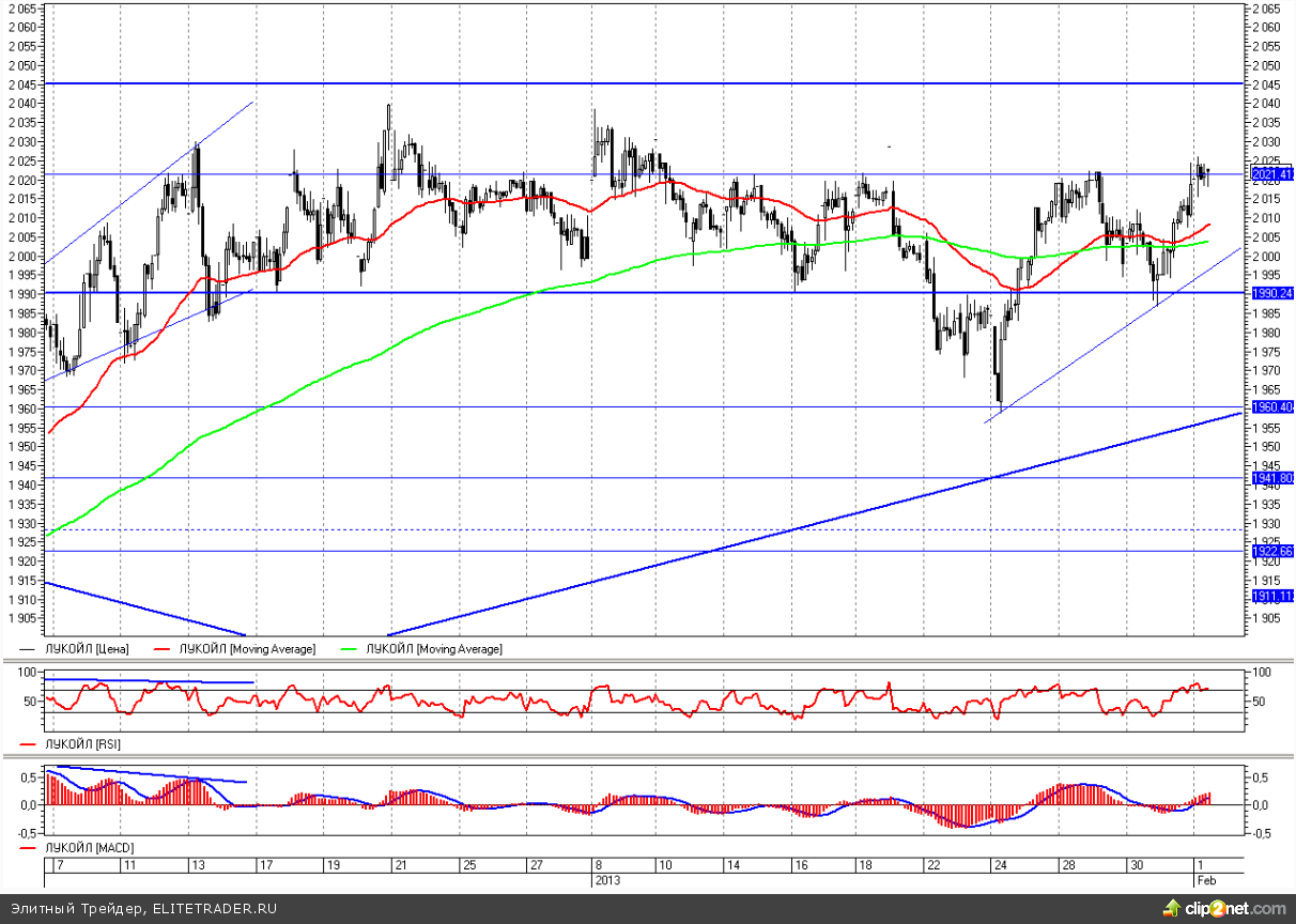 С момента выхода последней торговой рекомендации ситуация в акциях Лукойла практически не изменилась, по-прежнему продолжается движение в боковике 1990 - 2045, при этом в четверг мы вновь наблюдали отскок вверх от его нижней границы. Ранее отметка 1990 уже пробивалась, как вверх, так и вниз, что позволяло судить о снижении актуальности данной поддержки, однако в четверг она показала, что еще «пользуется уважением». Движение вбок может растянуться еще надолго, к тому же Лукойл является бумагой, подверженной боковой динамике, и нам ничего не остается, как играть на отскоках от границ отмеченного диапазона, с готовностью переворачиваться в случае пробоя одной из границ. Другими словами, возвращаемся к торговому плану декабря.