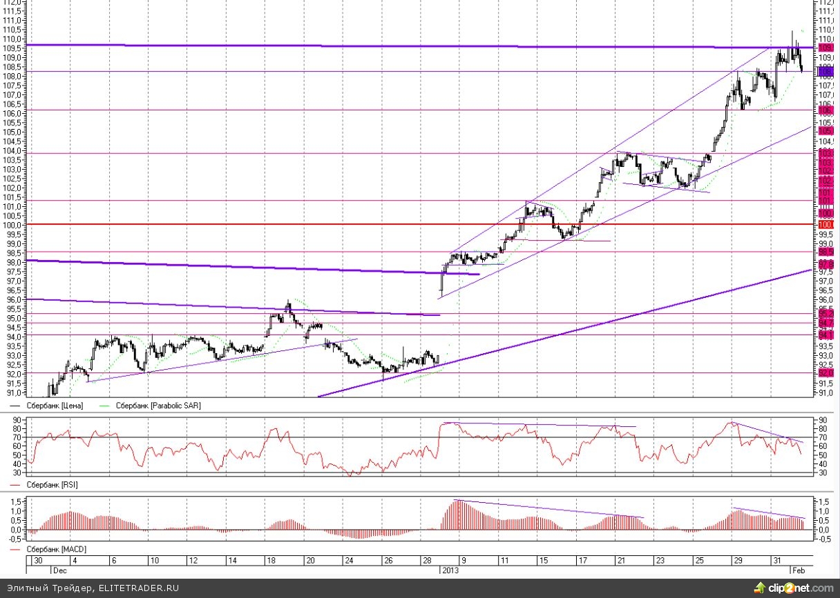 Акции Сбербанка на текущей неделе продолжили неуклонный рост несмотря на технические сигналы о перекупленности. Причины подобной активности покупателей в большей степени прояснились после сообщений о скором исчерпании лимита в программах конвертации акций в ADR. При этом появление самой новости видится не самым позитивным фактом для дальнейшего роста, хотя в пятницу котировки обновили двухлетние максимумы. Однако закрепиться, как видим, выше нисходящего тренда развивающегося от исторических максимумов цене не удалось. Таким образом, по-прежнему консервативно подходя к текущей ситуации, можно говорить о наборе коротких позиций после пробоя поддержки на уровне 106,1. Однако к настоящему моменту появился еще один ориентир - это поддержка на 108,2, пробой которой может быть использован как сигнал к продажам с целью возвращения к 103,8. В частности если на дневном таймфрейме сегодня удержится разворотная свеча пробой может быть осуществлен в понедельник. В то же время уже сегодня будут опубликованы данные по рынку труда США, что может спровоцировать ускорение нисходящего движения с потенциальным выходом на медвежье поглощение на дневном графике. Стоп можно расположить на уровне 109,5.