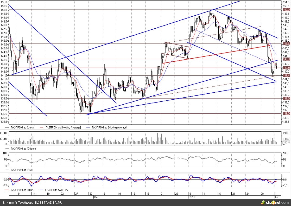 В итоге Газпром на новой волне падения пробил двухмесячный восходящий тренд с конца ноября - начала декабря в районе 143,5 и в моменте провалился до 142. Снижением во второй половине января было отыграно более половины среднесрочной волны роста с ноябрьских минимумов.