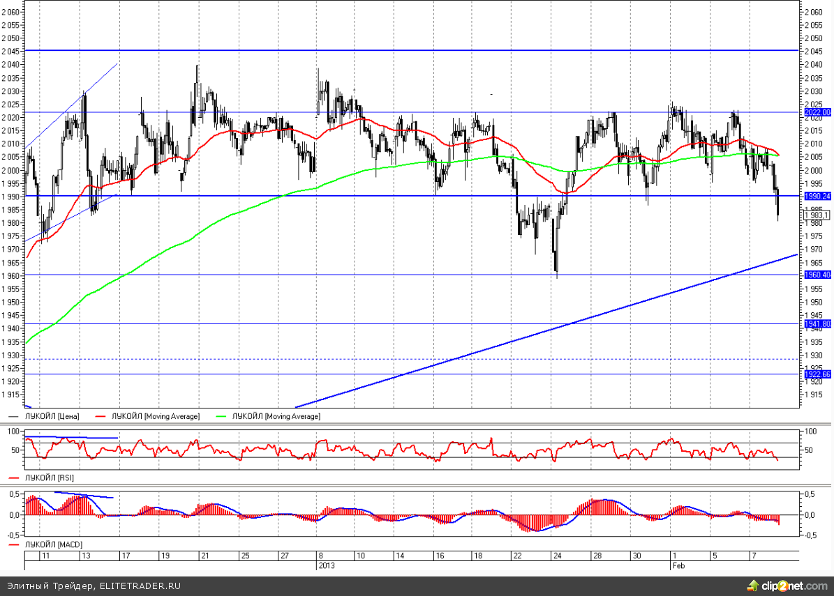 После выхода последней торговой рекомендации, ситуация в акциях Лукойла практически не менялась, и бумага продолжала динамику в боковике 1990 - 2045. Однако сегодня нижняя граница этого диапазона не устояла под натиском продавцов, и сейчас мы наблюдаем за выходом бумаги из длительного боковика. Соответственно у нас появилась отличная возможность открывать краткосрочные шорты с целью в районе 1960 - 1970, где располагается минимум за последние 2 месяца, а также проходит линия восходящего тренда с середины мая прошлого года. В районе этих уровней можно будет фиксировать часть короткой позиции с возможностью ее восстановления в случае пробоя вниз уровня 1960. При таком развитии событий снижение очень быстро продолжится на 1940 с потенциалом возврата на 1890. Стоп же по коротким позициям можно ставить чуть выше уровня 2000.