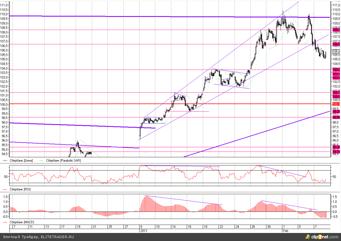 Как и предполагалось, котировки акций Сбербанка во второй половине прошедшей недели все же вышли на реализацию двойной вершины после ряда неудачных попыток сформировать ту или иную разворотную фигуру. С пробоем поддержки на 106,6 пал и месячный восходящий тренд. В пятницу цена нашла локальную поддержку на уровне 105, отыграв лишь половину потенциала двойной вершины предполагающей возвращение к 103-103,8. Более того, если натиска медведей не выдержит уровень 103,8, потенциал снижения откроется вплоть до 101,3. На дневном таймфрейме в уходящую неделю сменились сигналы трендового индикатора Parabolic, который теперь говорит о доминировании нисходящего тренда. В то же время индекс относительно силы покинув верхнюю зону экстремальных значений только начинает свое снижение к противоположной области. На неделе BoNY сообщил об исчерпании лимита по конвертации акций в ADR и говорить о позитиве здесь для локальных акций можно скорее рассчитывая на рост в ADR, и последующее расширение программы, без которого локальные бумаги теряют привлекательность.