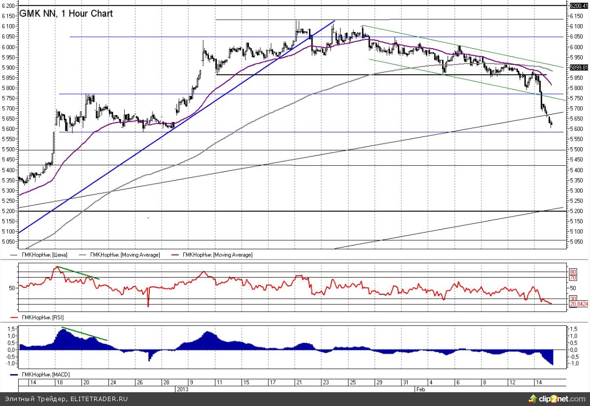В данный момент бумаги Норникеля торгуются около уровня 5630 руб., теряя 0,85%. В прошлой рекомендации мы советовали продолжать удерживать короткие позиции в бумагах ГМК. Целью нисходящего движения называлась область 5690-5700 руб. Вчера в рамках ускорения нисходящей волны эти рубежи были благополучно достигнуты (профит по сделке около 2,5%). Более того, медведям даже удалось спуститься еще ниже, открыв себе дорогу в сторону 5510 руб. Именно сюда в ближайшее время могут отправиться акции ГМК. Здесь проходит коррекционный уровень в 38,2% по Фибоначчи к тому росту, который имел место с конца ноября прошлого года.