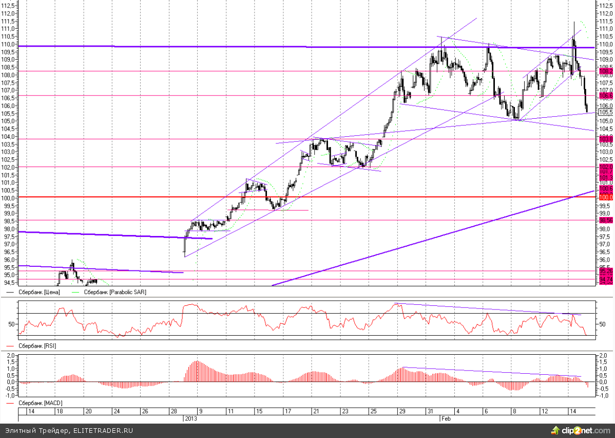 Уходящая неделя в акциях Сбербанка едва не отметилась выходом к историческим максимумам, до которых цена не дотянула менее 1,5%. Однако оставив на этих уровнях длинный хвост разворотной дневной свечи, цена ушла в глубокое погружение, которое к настоящему моменту грозит вылиться в реализацию разворотной фигуры «двойная вершина» с основанием в районе 105-105,5, цели которой простираются вплоть до психологически важного рубежа на 100 руб. К подобному сценарию склоняет и медвежья дивергенция по RSI, MACD как на часовом, так и на дневном таймфреймах. На пути к обозначенному уровню, медведи могут встретить сопротивление в районе 103,8 и 102, где может быть найдена локальная поддержка с дальнейшим тестированием снизу основания формации и последующим рывком вниз.