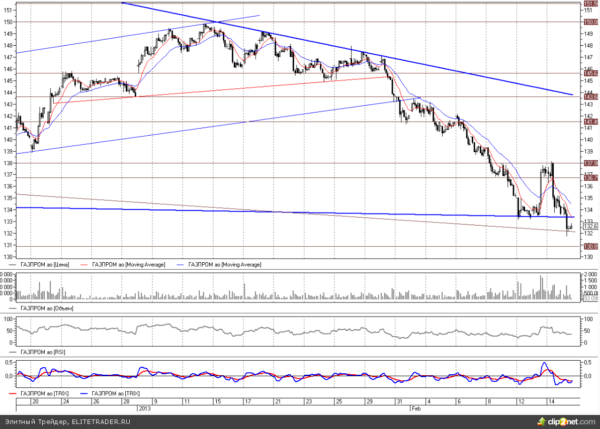 После небольшого коррекционного отскока на неделе падение возобновилось, что снова вызывало у трейдеров непреодолимое желание избавляться от бумаг. Подгоняемая продавцами цена пробила отметку в 133 рубля, откатившись еще ниже. «Черная полоса» в жизни Газпрома продолжается.