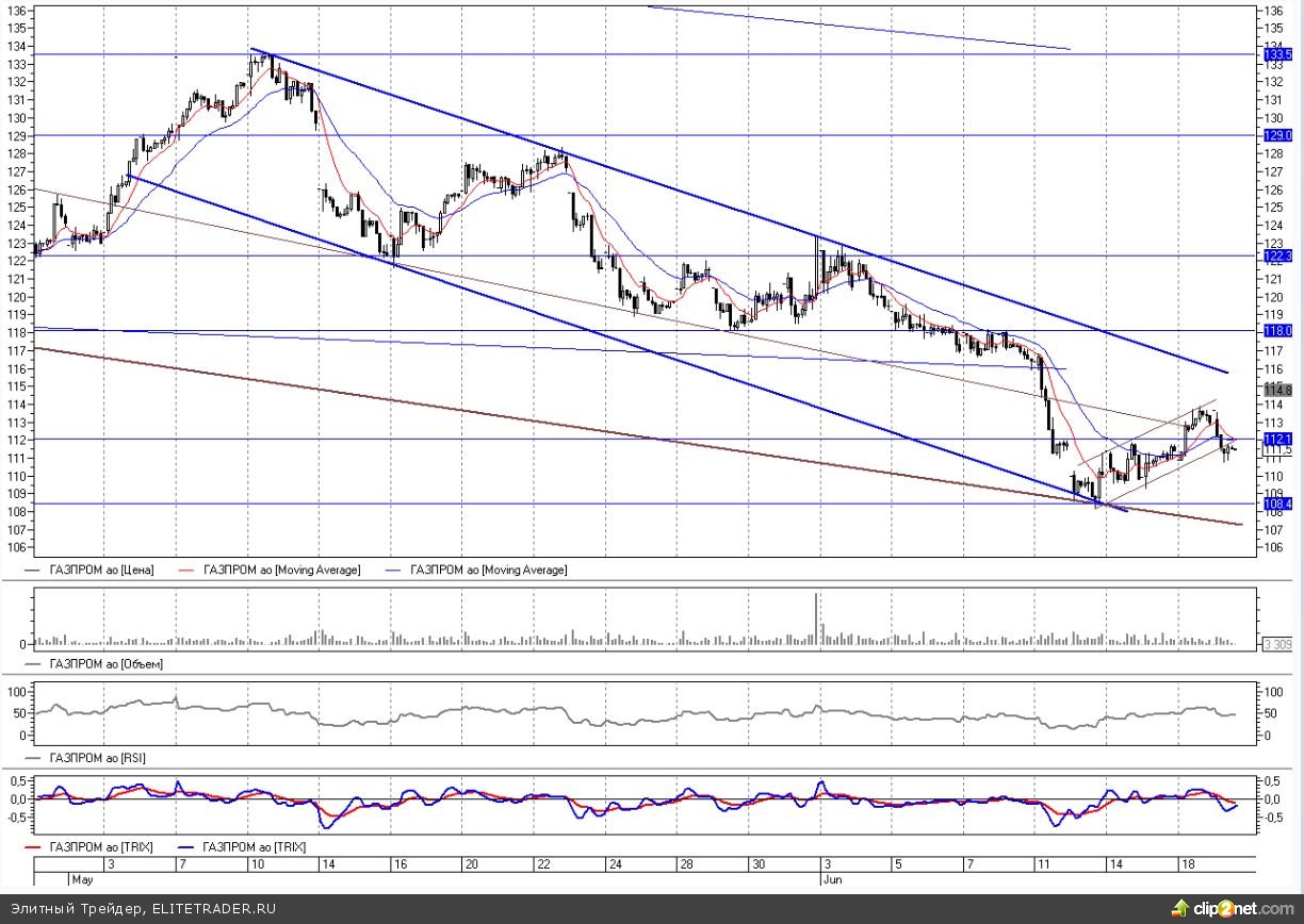 Но и на отскоке бумаги газового концерна выглядели слабее рынка. В результате, от текущих минимумов июня акции цена находится всего лишь на 3% выше. И после локального отскока с возвратом к нижней границе локального восходящего канала на 112,5 может прокатиться новая волна продаж еще ближе к минимальным значениям.