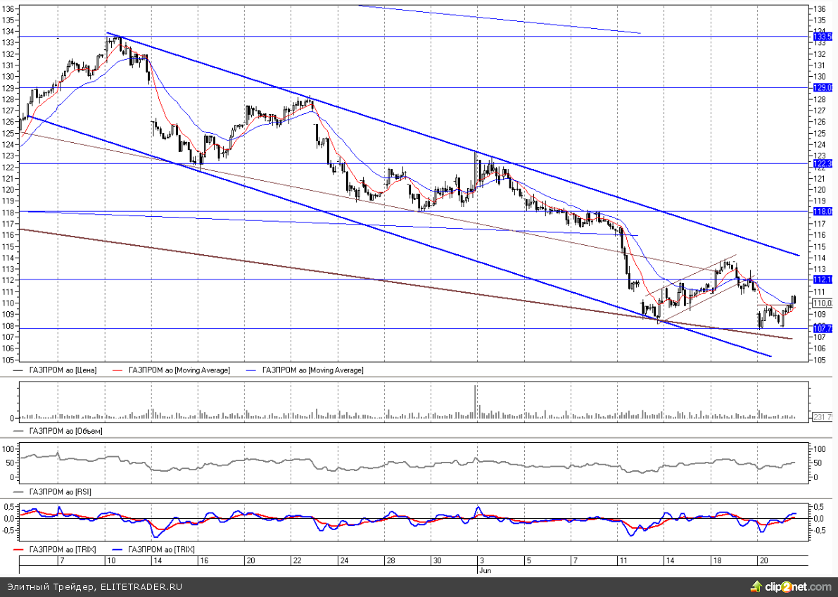 Во второй половине недели газовый концерн возобновил снижение, опустившись уже до 108 рублей. Событие прошло довольно буднично, и уже в пятницу от 108 последовал технический отскок. Более того, этим движением было сформировано локальное «двойное дно», которое будет способствовать продолжению коррекции с ближайшими целями на 111-112, где у бумаги остался незакрытый гэп.
