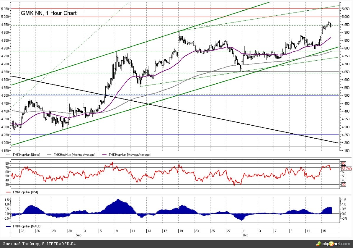 В данный момент бумаги Норникеля торгуются около уровня 4950 руб., теряя 0,35%. В прошлой торговой рекомендации мы снова и снова советовали продолжать удерживать длинные позиции. В качестве главной цели восходящего движения все также назывался уровень 4950 руб. В итоге вчера этот рубеж наконец-то был достигнут, так что лонги благополучно закрыты. В то же время напомню, что от 4950 предлагалось открывать спекулятивные короткие позиции, однако судя по сегодняшней динамике, часть накопленной от предыдущего трейда прибыли возможно придется отдать, так как стоп-заявки мы выставляли (4985) совсем рядом. Есть ощущение, что это решение будет ошибкой, но лучше имеющиеся короткие позиции все-таки закрыть, так как четких разворотных сигналов пока так и не появилось. Тем более, пока дают выйти в безубыток.