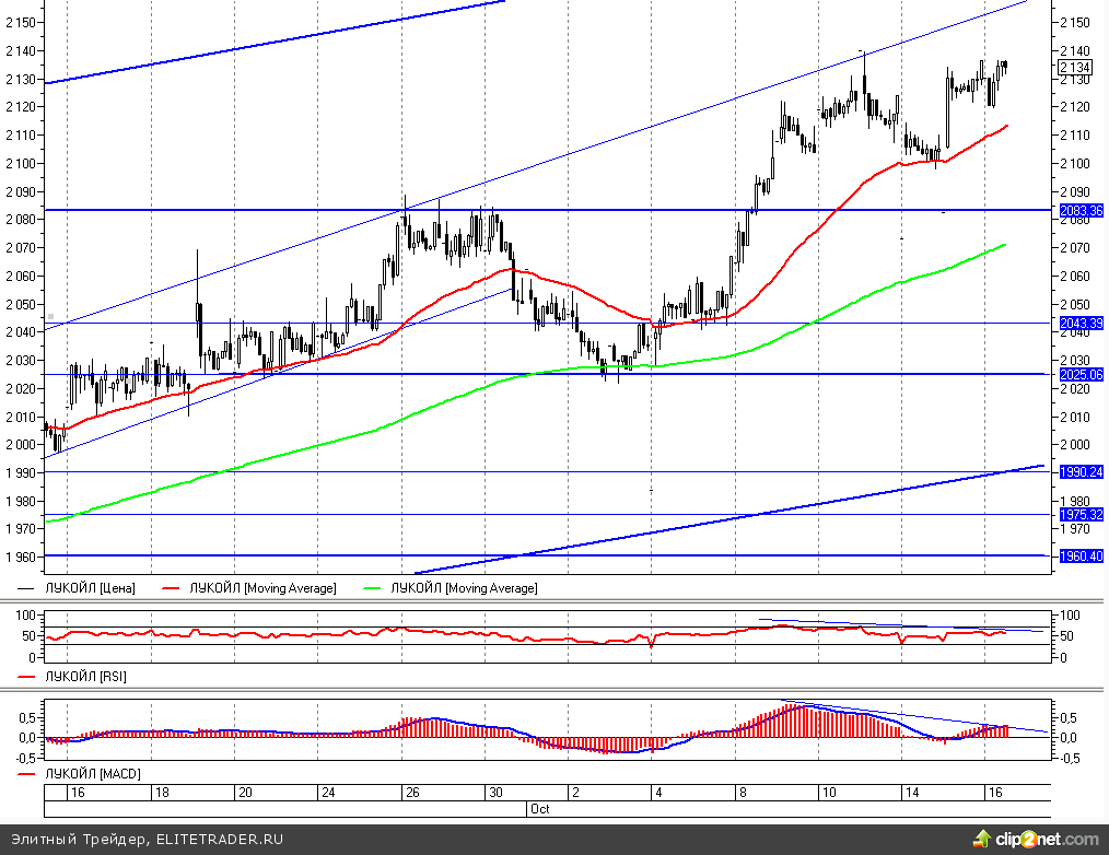 С момента выхода предыдущей торговой рекомендации акции Лукойла не продемонстрировали никакой существенной динамики, некоторый провал начала недели был успешно выкуплен во вторник, и к текущему моменту бумага вернулась к своим долгосрочным максимумам, достигнутым в пятницу. Таким образом, пока мы продолжаем развитие позитивного сценария, однако вторая вершина текущей растущей формации образуется уже не без труда, что говорит о вероятности очередного провала. Подтверждает эту вероятность и медвежья дивергенция, образованная с техническими индикаторами на часовом графике. В этом свете мы имеем 2 пути для формирования торгового плана, это либо ожидать снижения для возобновления покупок, либо искать точку для шорта от максимумов. Второй сценария пока видится более удобным в реализации, и если в ближайшее время мы увидим очередной резкий скачок вверх, и тем более образование «шипа» на максимумах, то можно будет смело открывать шорты в расчете на коррекционное движение в район 2080 - 2100. Если же говорить о конкретных уровнях, то удобным для этого видится пока диапазон 2160 - 2180, при этом стоп придется ставить достаточно высоко, в районе 2200.