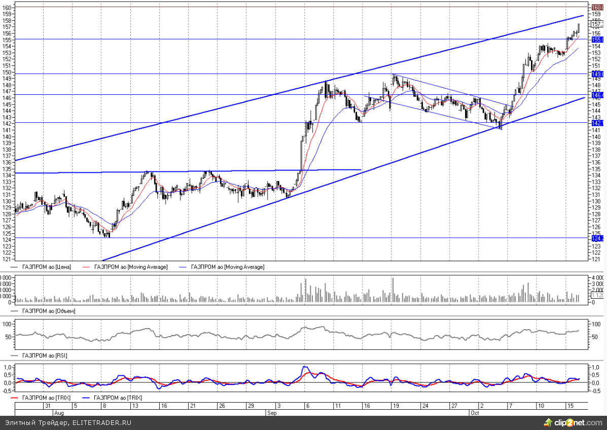 Газпром снова, прибавляя понемногу, карабкается вверх и поднимается на новые годовые максимумы. Сегодня цена превысила уже отметку в 157 рублей, рост продолжается четвертый месяц подряд. За это время бумага проделала большой путь, прибавив почти 50% своей стоимости (от 107 до 157).