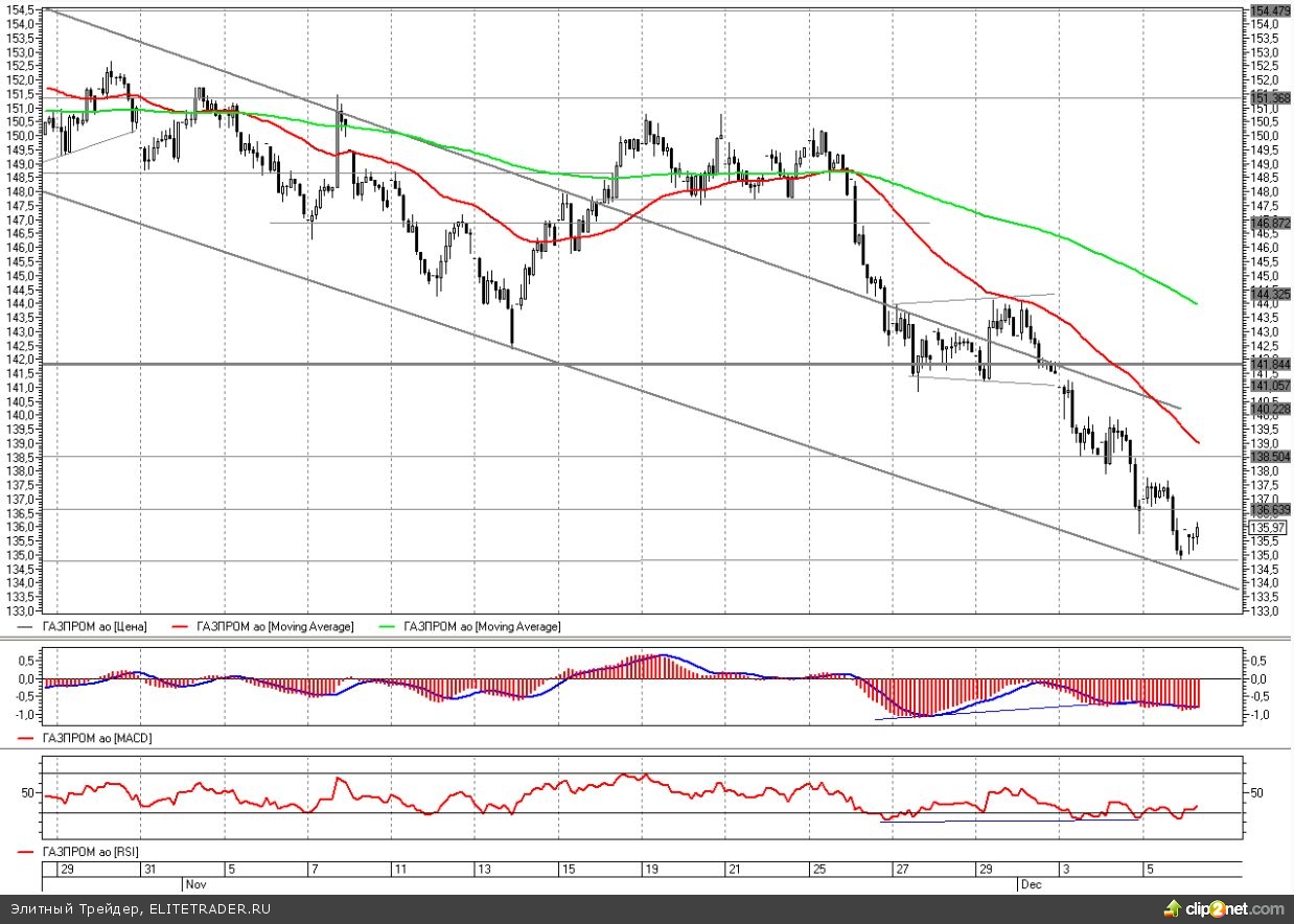 Данный уровень поддержки сейчас, по факту, является последним на пути снижения вплоть до диапазона 130 - 131, который выступил оплотом для развития восходящего тренда в конце лета текущего года. Тем не менее, снижение сейчас идет довольно напряженно, с натяжкой, что вблизи диапазона поддержки 134 - 135, может говорить о перспективе коррекционного отскока, или, хотя бы, краткосрочной консолидации. В этом свете есть смысл перевернуться и попробовать отыграть появившиеся задатки отскока, хотя в целом, относительно рынка, акции Газпрома выглядят не очень уверенно.