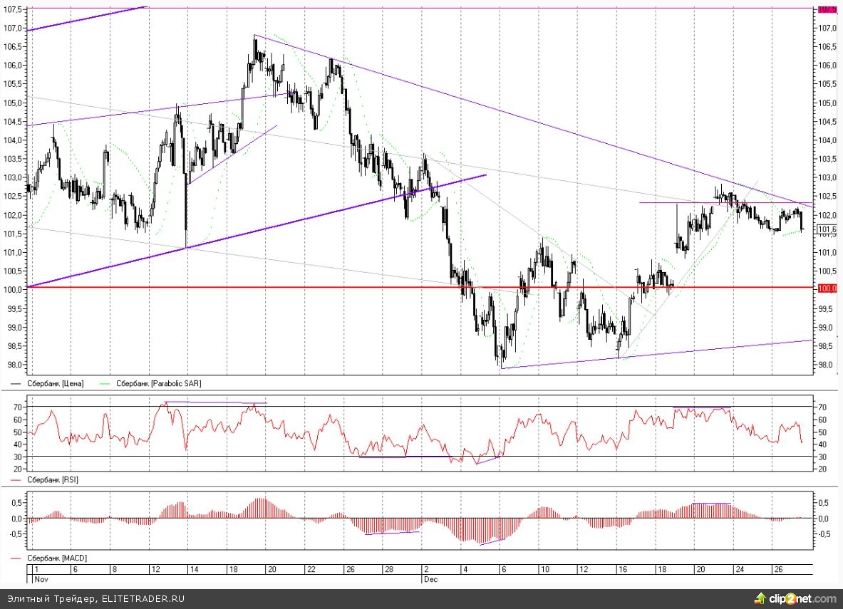 Достигнув в начале уходящей недели целевого диапазона отскока 102,3-103, цена на акции Сбербанка впоследствии стала медленно, но верно отступать. Снижение конечно проходило очень вяло на фоне отсутствии торгов на западных площадках в связи с католическим Рождеством. Тем не менее, из района этих уровней, как видим, краткосрочно можно было играть на стороне медведей. Подтверждением развития отката от месячного down-тренда был пробой недельного восходящего тренда соответственно с выходом из данного диапазона.