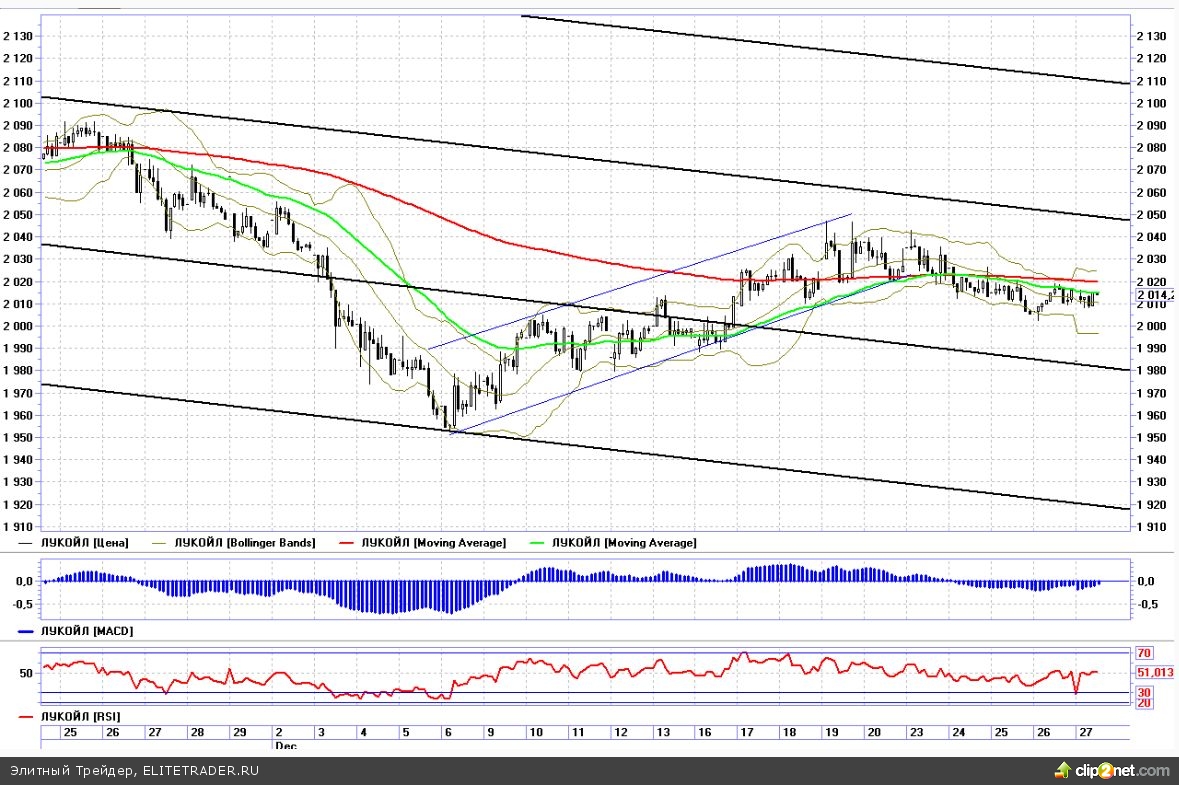 На текущий момент ничего существенно не изменилось: котировки Лукойла продолжают находиться в очень узком торговом диапазоне посередине долгосрочного нисходящего канала. Общая ситуация на российском рынке точно такая же - участники торгов не особо проявляют инициативу перед приближающимися новогодними праздниками, объемы при этом существенно снизились. На случай, если покупатели все же проявят инициативу, мы оставляем рекомендацию открывать лонг при уверенном пробое уровня 2050 с фиксом на 2075 и стопом на 2040.
