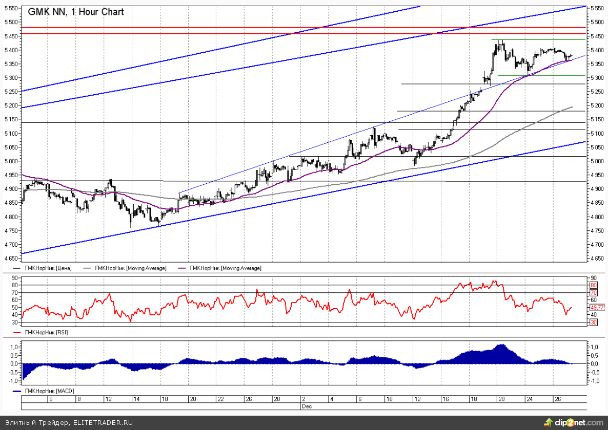 В данный момент бумаги Норникеля торгуются около уровня 5380 руб., прибавляя 0,25%. В прошлой рекомендации мы советовали, не дождавшись целей, закрывать свои короткие позиции с минимальным профитом. Вместе с тем также предлагалось выставить новые заявки на продажу в районе 5460-5480. С тех пор ситуация в бумагах Норникеля существенно не изменилась - котировки находятся примерно на тех же уровнях.