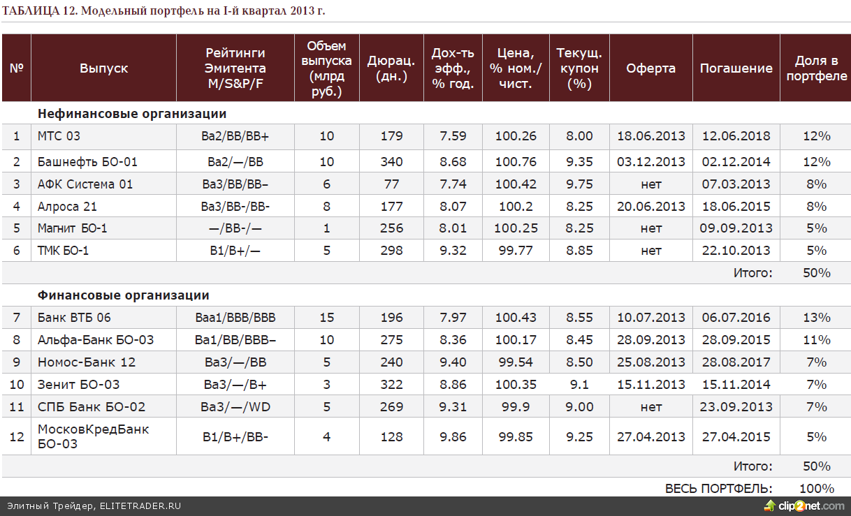 Предлагаемый нами модельный портфель включает в себя облигации, даты оферт/погашений которых не выходят за рамки одного года, его Вы можете увидеть в представленной ниже таблице. Все предлагаемые нами бумаги обладают хорошей ликвидностью, что является далеко не самым последним параметром при формировании качественного бондового портфеля.