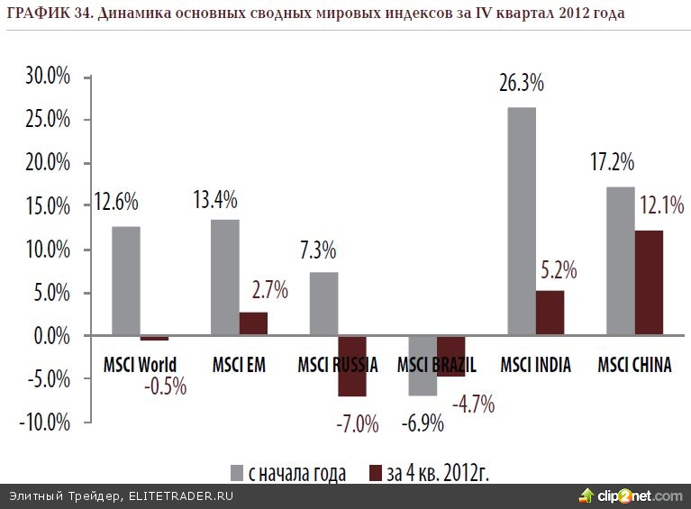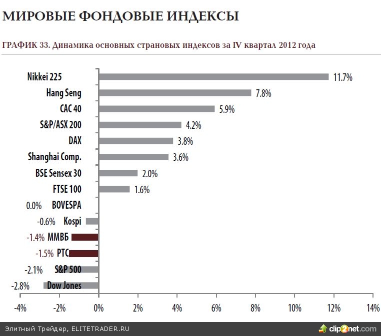 На большинстве фондовых площадок в 4 квартале наблюдался «боковик». Исключением стали азиатские рынки – японский Nikkei 225 прибавил почти 12%, а китайский Hang Seng 8%. Рост японского рынка объясняется принятыми Банком Японии стимулирующими мерами, а китайского – его перепроданностью и наблюдавшимся притоком средств в фонды, ориентированные на Поднебесную (приток составил порядка 10 млрд долларов). Индексы США и европейских стран по итогам 4 квартала остались на прежних уровнях – их изменения укладываются в «статистическую погрешность» 2-3%. Слабее остальных смотрелись российские индексы (-1.5% по индексам ММВБ и РТС).