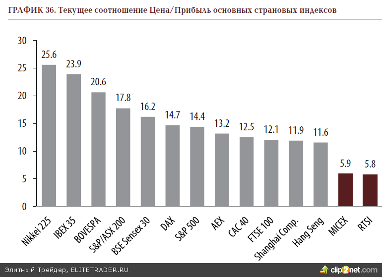 Российский фондовый рынок продолжает оставаться одним из самых недооценённых – он заметно дешевле зарубежных аналогов. В текущий момент показатель «Цена/Прибыль» (P/E) российского рынка составляет менее чем 6. В то же время бразильский и индийский рынок оценены в 3 раза дороже, а китайский – более чем в 2 раза. Безусловно, потенциал российского рынка огромен. В то же время пока не ясно, когда этот потенциал начнёт отыгрываться.
