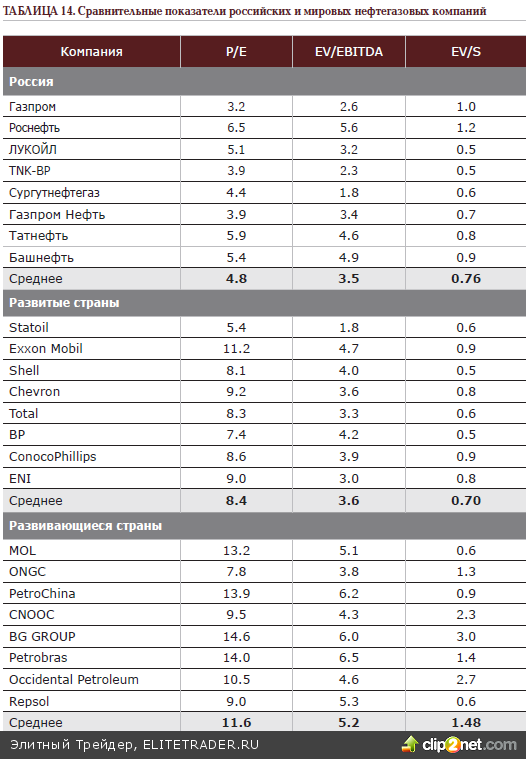 К примеру, отношение P/E для «Газпрома» составляет 2.6. «Газпром» оценён меньше чем в три годовые прибыли – самый низкий среди российских «голубых фишек» показатель. Это связано с негативным взглядом на компанию западных инвесторов – им не нравится, что прибыль «Газпрома» не доходит до миноритарных акционеров, а расходуется на бонусы менеджеров и капитальные затраты. При росте капитальных затрат «Газпром» планирует направлять на дивидендные выплаты не менее 25% чистой прибыли – на наш взгляд, труднореализуемые планы.