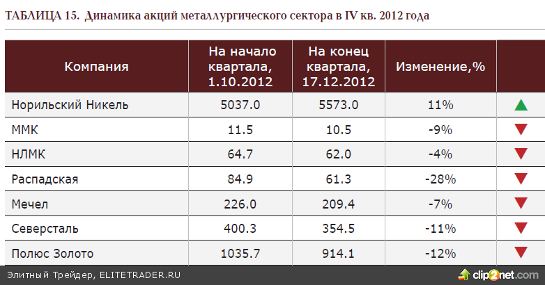 Из событий квартала отметим продажу акций «Распадской», принадлежащих менедженту компании «Евразу». «Распадская» до сих пор не восстановила свою главную шахту после аварии в мае 2010 года (вероятно, для восстановления нужны масштабные вложения, или это вообще невозможно). «Евразу» так и не удалось найти покупателя на этот актив (переговоры велись с «Северсталью», НЛМК и другими «металлургами» - не сходились в цене актива). По всей видимости, «Евраз» принял решение самостоятельно заняться восстановлением шахты. Затраты на восстановление «Распадской» оцениваются в 150-250 млн долларов (в случае необходимости восстановления только оборудования и инфраструктуры) до 600-700 млн долларов (в случае необходимости строить шахту заново). Возможно, после этого «Распадская» вновь будет выставлена на продажу. «Евраз» не стал выставлять оферту на выкуп акций «Распадской» миноритариям, что негативно сказалось на её котировках.Намного лучше в 4 квартале чувствовали себя компании «цветной металлургии». По всей видимости, стимулирующие меры властей в Китае – крупнейшем потребителе цветных металлов (40% мирового потребления никеля и меди) –возымели своё действие. Спрос на никель, медь, палладий возрос.