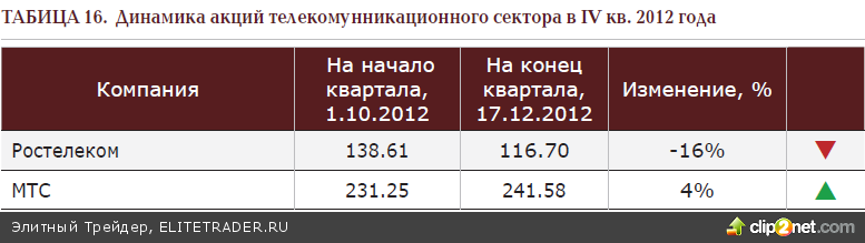 В 1 квартале 2013 года мы ждём от телекоммуникационного сектора динамики лучше рынка. Компании сектора показывают стабильный рост финансовых и операционных показателей, а уровень проникновения мобильной связи в РФ достаточно высокий (140-160%). Большинство компаний сектора планирует выплатить высокие дивиденды за 2012 год, что поддержит спрос. Кроме того, телекоммуникационный сектор считается защитным на случай мирового кризиса, т.к. спрос на его услуги стабилен.На наш взгляд, текущие уровни «Ростелекома» выглядят привлекательными для покупки. Драйверами роста могут стать изменение дивидендной политики компании (она до сих пор не утверждена) или размещение в Лондоне. В перспективе «Ростелеком» может стать «голубой фишкой» российского фондового рынка, представляющий российский телекоммуникационный сектор