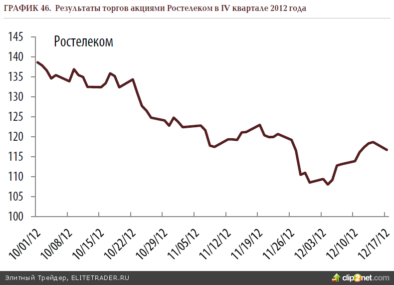 «Ростелеком» Акции компании были перепроданы в ноябре 2012 года. Драйверами для роста бумаг может стать изменение дивидендной политики компании и размещение в Лондоне. В перспективе «Ростелеком» может стать «голубой фишкой» российского фондового рынка, представляющей телекоммуникационный сектор, а зарубежные фонды будут докупать бумагу в свои портфели