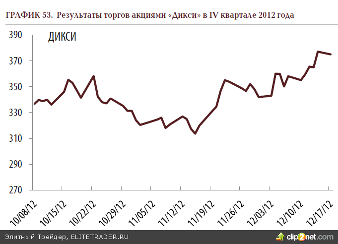 На наш взгляд, по ценовым уровням привлекательнее выглядят акции «Дикси», также динамично развивающейся компании - за 9 месяцев выручка выросла на 56%, а торговые площади выросли на 23% (начал проявляться синергетический эффект от присоединения «Виктории», более явно он будет заметен в следующем году). Сдерживающим фактором для акций «Дикси» служит их невысокая ликвидность и отсутствие GDR – из-за последнего их не включают в свои портфели западные инвесторы.