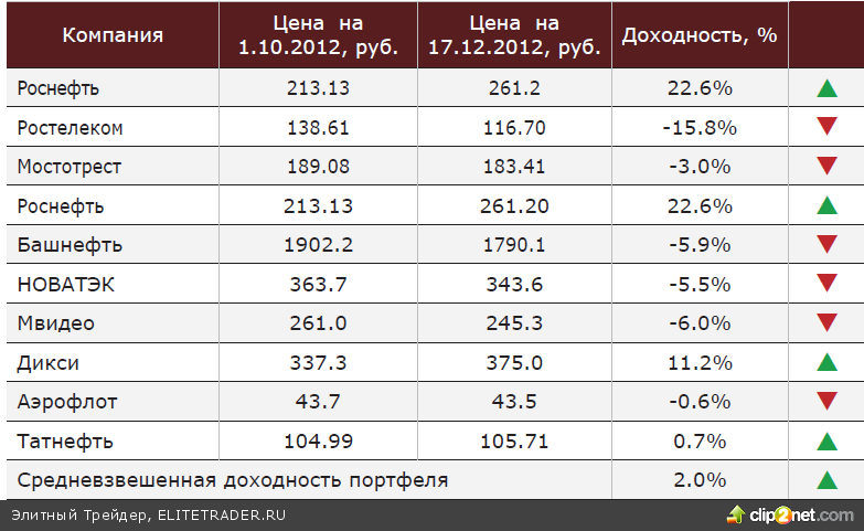 Наши инвестиционные идеи за 3 квартал проявили себя неплохо. Нас несколько «подвели» акции «Ростелекома» (-16%), снизившиеся после проведённых в офисе компании обысках. Такие события сложно предсказать – они являются одним из главных рисков вложения в акции. В любом случае, результат портфеля(-0.3%) оказался выше, чем индекс ММВБ(-1.4%). Наилучшим образом проявили себя акции «Роснефти» (+22%) и «Дикси» (+11%). Последняя, на наш взгляд, сохраняет заметный потенциал роста, и мы включили её в список рекомендаций на 1 квартал 2013 года.